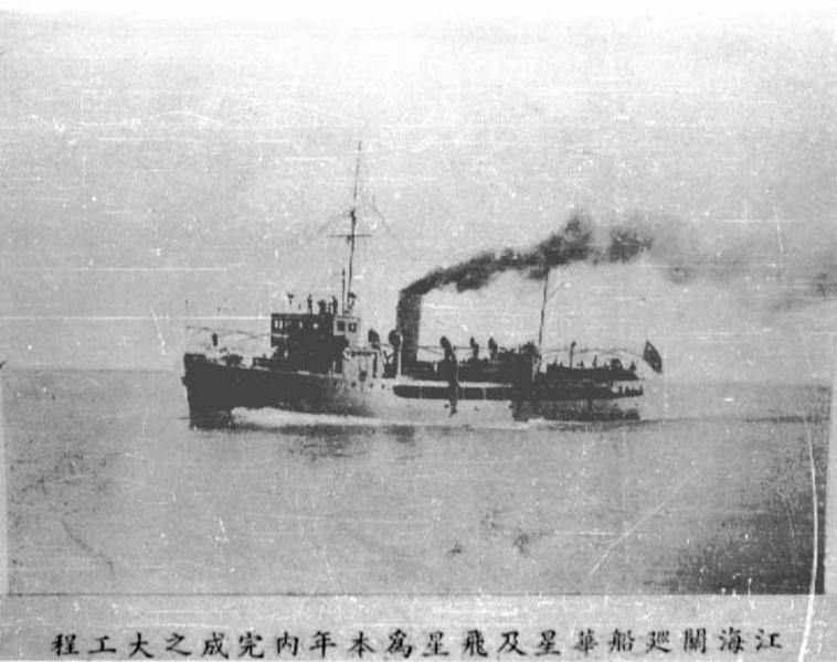 Caption on support : Jiang haiguang xunchuan Huaxing ji Feixing wei ben nian nei wancheng zhi da gongcheng (The Yangtze river customs coastguard vessels Huaxing and Feixing used within this year in order to complete big projects)
