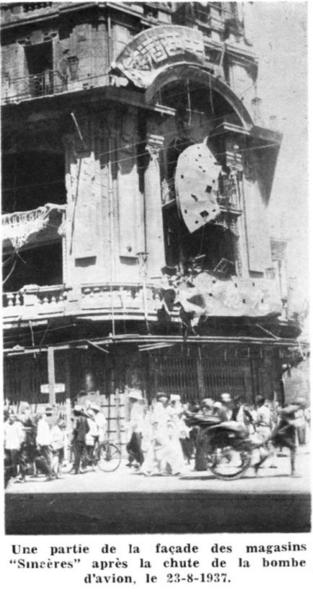 Caption on support : Une partie de la façade des magasins 'Sincères' après la chute de la bombe d'avion, le 23-8-1937. (A side of the façade of the 'Sincères' company after the explosion of bomb thrown by a plane, 23rd August 1937.)'