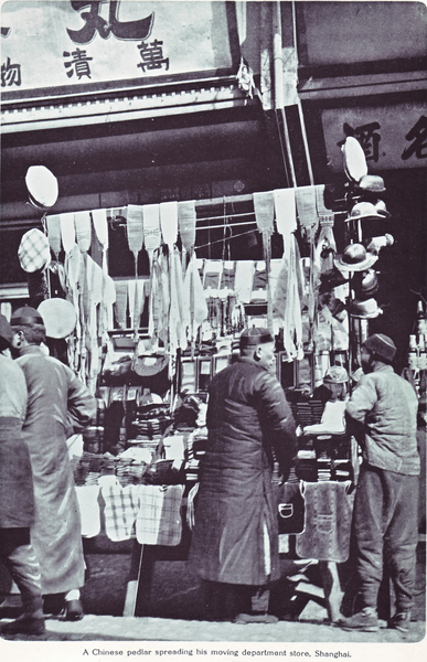Caption on support : A Chinese peddler spreading his moving department store, Shanghai
