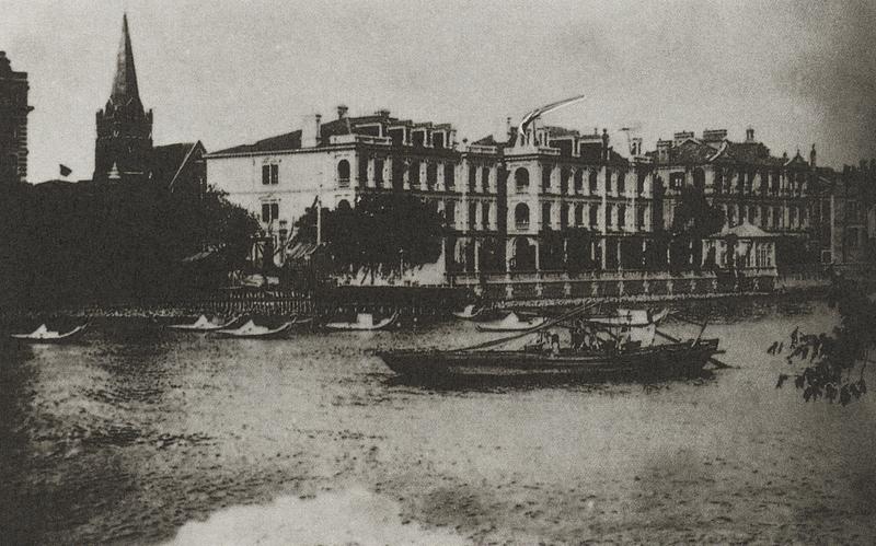 Information data : The German Consulate-General on the Hongkew Bund opened in 1886 and was pulled down in 1937. The German chapel at left was completed in 1903.