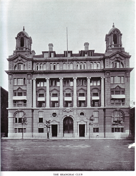 Information data : The Shanghai Club was the most exclusive club in Shanghai. It was established in 1864 firstly as a four-storeyed building in the so-called 'East-India style' (or neo-colonial). The old building was demolished in 1908. The new Club opened in 1911 as a seven-storyed building in Neo-classical style. The main marble-floored hall, over 40 feet high, has six Ionic columns which would have fitted right in with London's club scene. On the upper floors were a card room, a writing room, dining room, a ballroom, and above that a number of bedrooms for resident members.