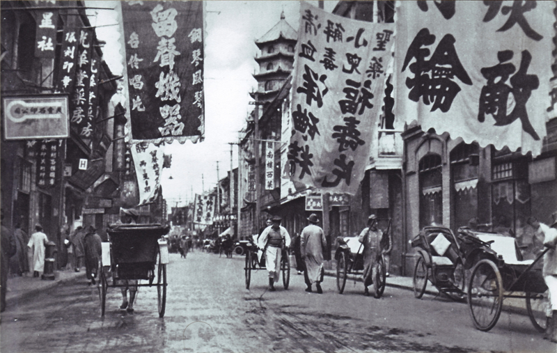 Caption on support : Foochow Road: The "Piccadilly" of Shanghai, showing the ubiquitous ricsha runner.