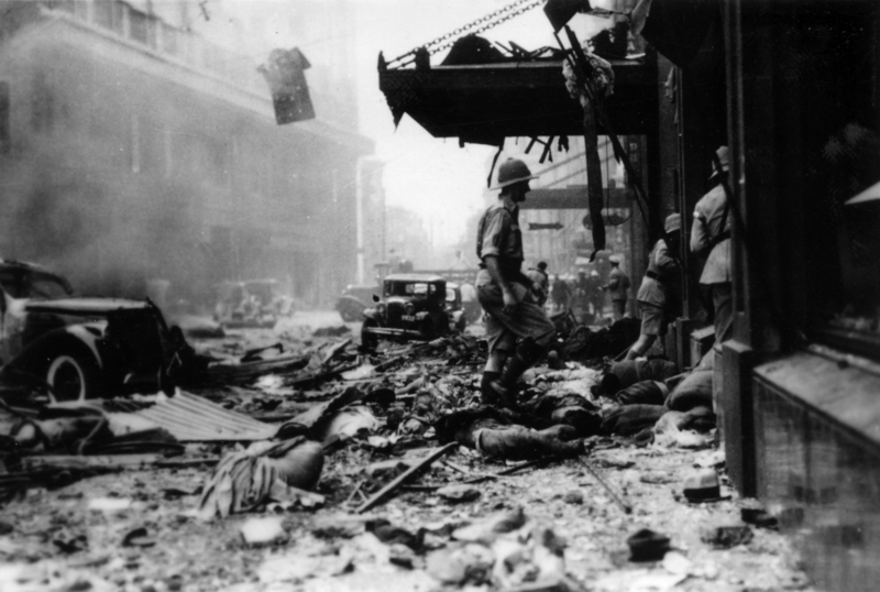 "Shortly after 4:30 this afternoon four Chinese bombing planes appeared out of the west from the direction of Lunghua and flew down the course of the Whangpoo, greeted by a hail of anti-aircraft fire from the Japanese men-of-war in the river. Upon reaching the area of the Bund center, one plane released four bombs of which two landed in the International Settlement, one penetrating the roof and top floor of the Palace Hotel, the other glancing off the side of the Cathay Hotel to continue through tbe canopy covering the entrance the Sassoon House and burst in the street.