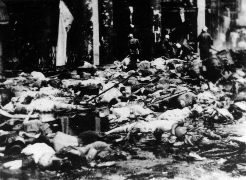 "Shortly afterwards another two bombs were dropped at the corner of Yu-Ya-Ching-Road and Av. Edward VII. Approx. 1300 people were killed or wounded."