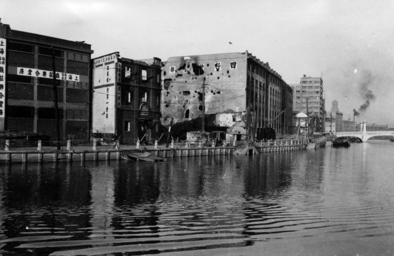 Caption on support : "The J.S.S. warehouse, in which 500 Chinese soldiers , cut off from their troops, defeated the Japanese until they were, under giving up their weapons, interned by british troops: After the capture"