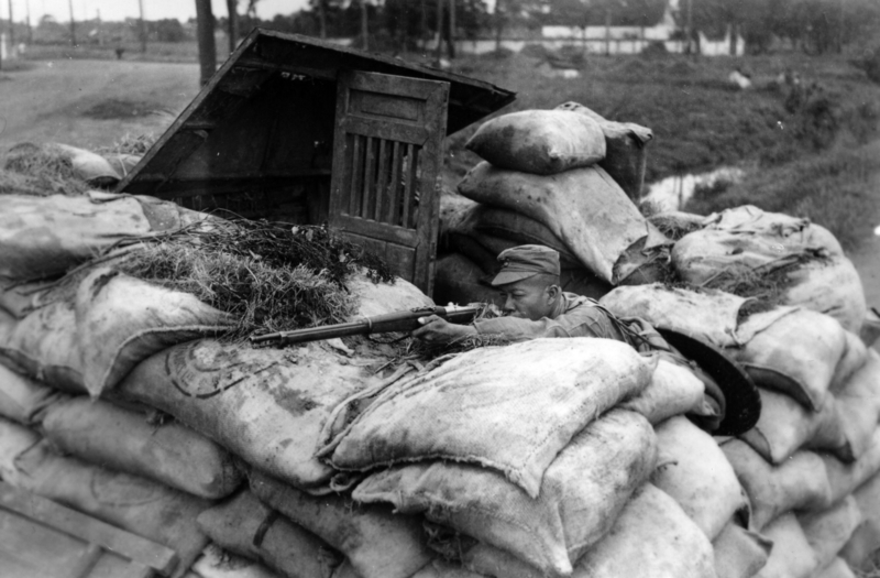 Chinese soldier behind a sandbag blockhouse in Hongqiao