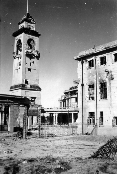 Keywords : war;bombing;racecourse;horse;ruin;clock
