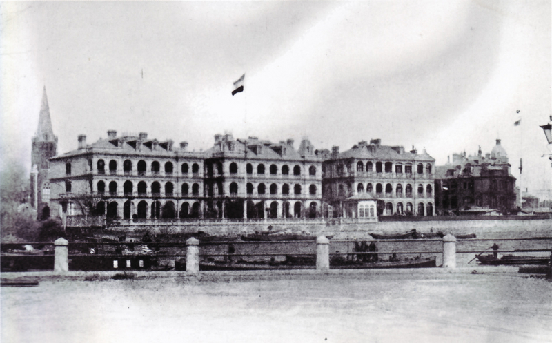 The German Consulate-General on the Hongkew Bund opened in 1886 and was pulled down in 1937. The German chapel at left was completed in 1903.