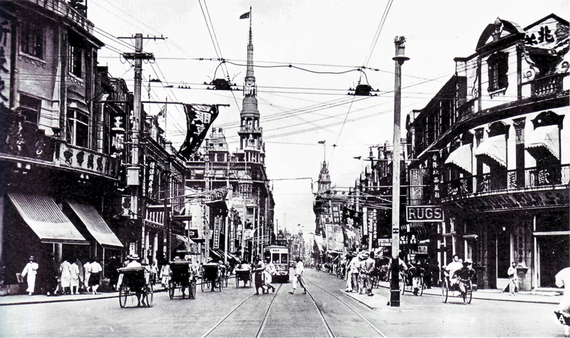Information data : This perspective on Nanking road can be compared to that in images ID 15107 and 15110. The building and the shops on the right hand side, especially the "RUG" shop sign, are visible on all three pictures. The first high spire on the left is the Sun Sun Department Store.