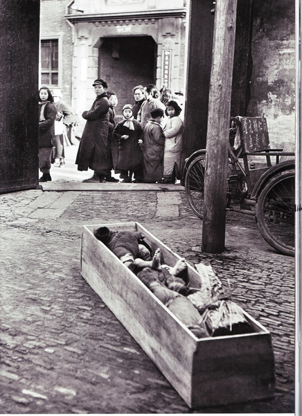 Caption on support : Children's corpses in a collective coffin await cremation on Christmas Eve. Shanghai, December 1947
