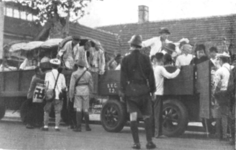 Caption on support : Threats of new hostilities in the Eastern area caused the evacuation of about 6.000 Chinese civilians from Yangtzepoo on August 31. Evacuation trucks were supplied by the Shanghai Volunteer Corps, the Police and household removal companies.