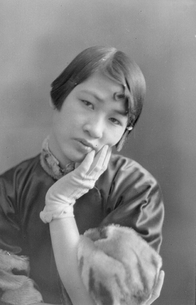 Title : Portrait of woman wearing white gloves and a silk jacket