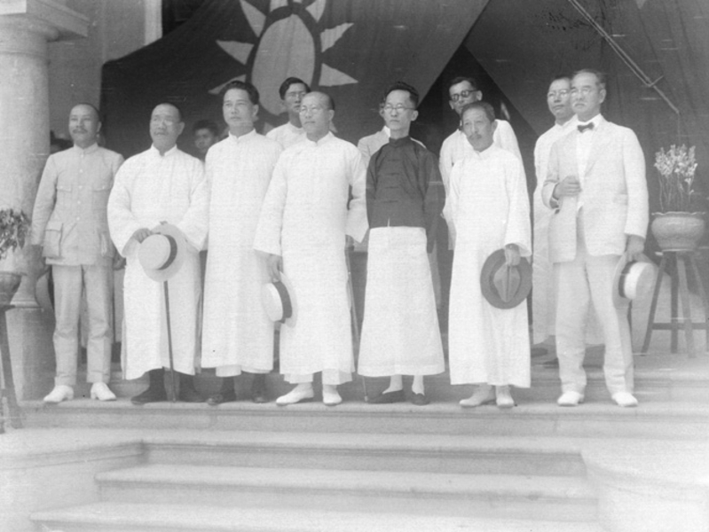 The Guomindang Political Council, Canton (Guangzhou), July 1925: Zhu Peide (first left); Wang Jingwei (third left), Chairman, left-wing Nationalist leader; Wu Chaoshu (front centre); Hu Hanmin (third right), right-wing Nationalist leader; Liao Zhongkai (second right), San Francisco-born left-wing leader, Minister of Finance; Eugene Chen (Chen Youren), Foreign Minister (first right). Mayor of Canton, Sun Ke, stands behind Liao and Chen.