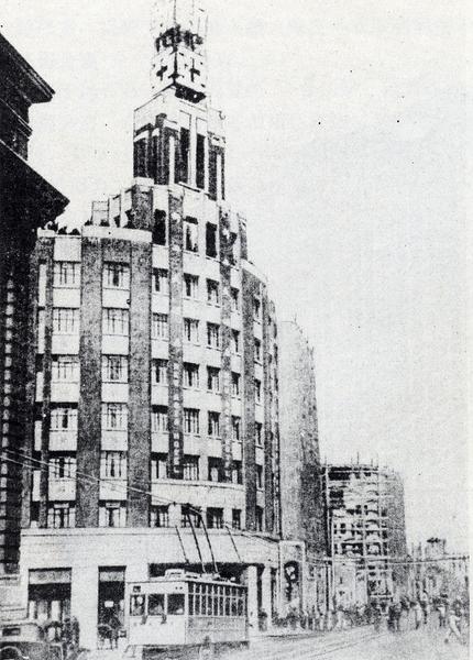 Information data : The New Asia Hotel (Xinya dajiulou ) opened c.1933. It was on N. Szechuen Road, with its entrance on Tiantong lu behind the General Post Office. It was a nine-story mansion and was the first hotel in Shanghai funded, designed, built and managed by Chinese.