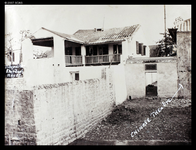 Photo is annotated in white ink 'Tidewaiter Shirdan's House' on the left and 'Chinese Theatre' on the right.