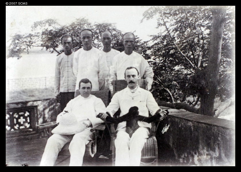 R.F.C. Hedgeland with E. H. de St. Croix, servants and Jacko, Hoihow