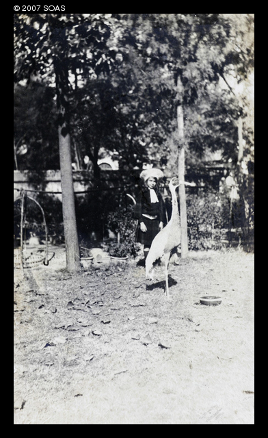Gigi Detring in Commissioner's garden, Tientsin, with a crane