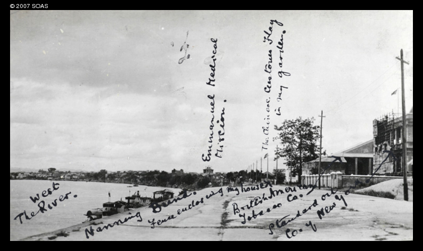 Caption on print : The West RIver. Nanning Bund. Emmanuel Medical Mission. Fence enclosing my house. The Chinese Customs Flag in my garden. British American Tobacco Co. Standard Oil Co. of New York.