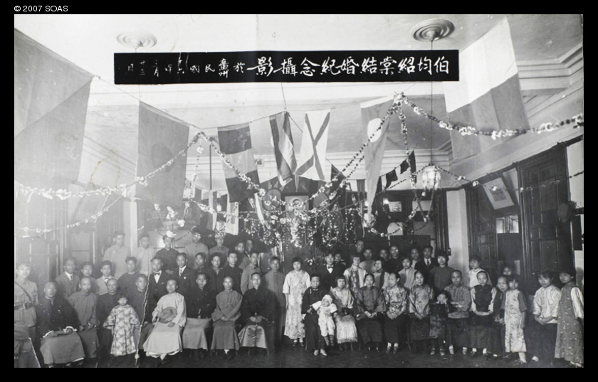 The Chinese characters written on the photograph can be translated as: The memorial photograph for Bojun and Shaotang's wedding, in Guangzhou, Republican year xxx, month xxx, day xxx. (The date is hard to read).