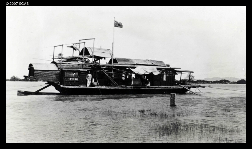 A junk berthed by a boat flying the red ensign, during floods at Nanning