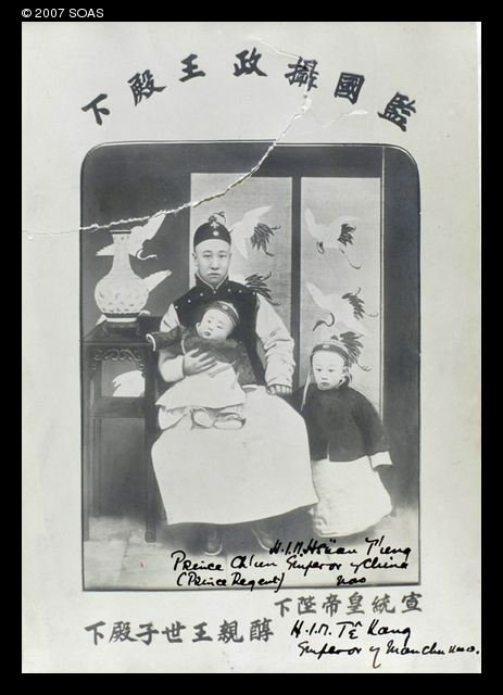 This photogaph depicts the Xuantong Emperor, better known as Puyi or the Last Emperor, and his father, Prince Chun, who acted as regent for the emperor during his minority. In 1934 the Japanese made Puyi emperor of Manchukuo under the reign name of Kangde.