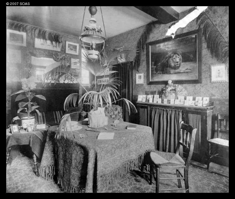 The photograph depicts a drawing room or similar in an unknown house, with a large framed photograph of a lion over the fireplace, probably in England.