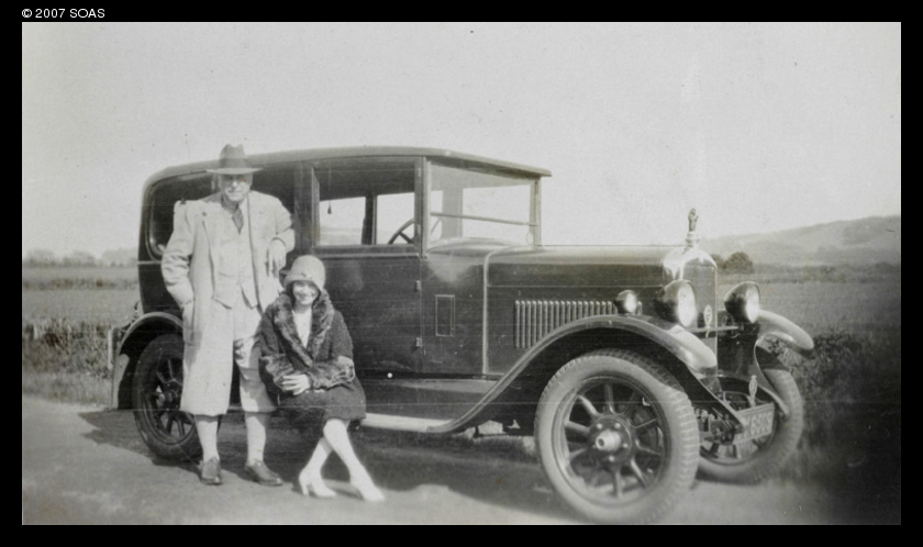The photo shows Hedgeland and an unknown woman posing by a saloon car with a London registration number (YV6509) and, possibly, a Chinese mascot on the bonnet.