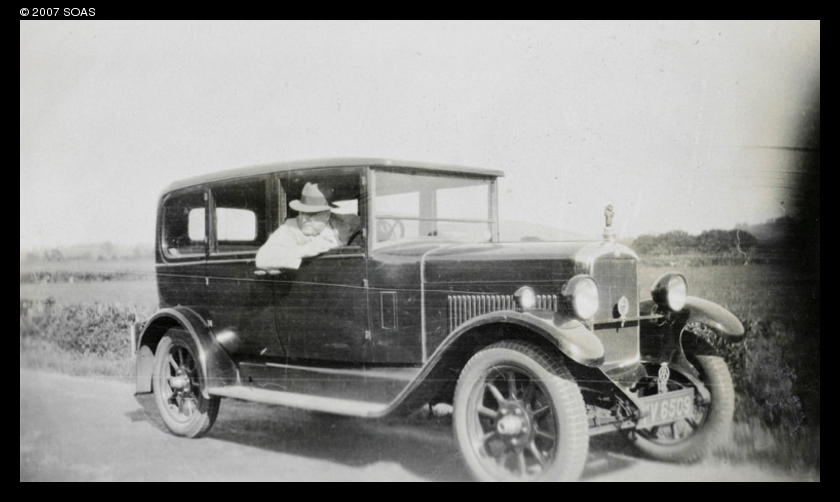 Photo shows Hedgeland in a saloon car with a London registration number (YV6509) and, possibly, a Chinese mascot on the bonnet.