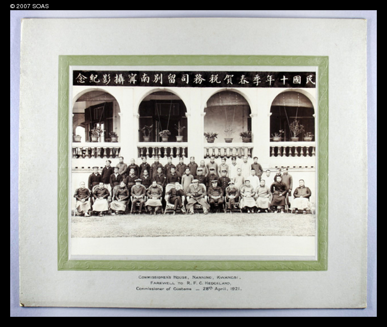 Caption on support : COMMISSIONER'S HOUSE, NANNING, KWANGSI. FAREWELL TO R.F.C. HEDGELAND, Commissioner of Customs - 28th April, 1921.