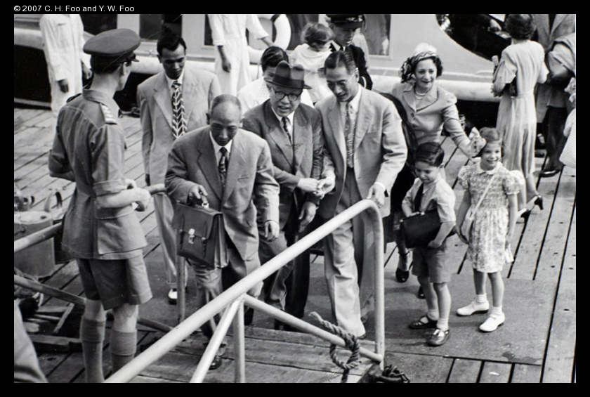 Fu Bingchang, another gentleman and a European family about to board a ship. Fu Bingchang is shaking hands with another man.