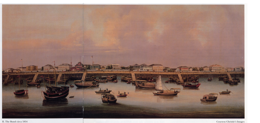Information data : A second painting, dated to 1854, adopts a nearly identical viewpoint and style to that of its 1850 predecessor. As a landscape piece viewed from the eastern side of the river, the Bund is depicted as a long row of buildings fronted by a relatively wide foreshore that terminates in a series of seven piers, braced with timbers and each surrounded by half a dozen Chinese-rigged vessels. In contrast to the recreational and almost bucolic setting of the previous painting, this 1854 work leaves no doubt in the viewer's mind that this landscape exists in the service of transport and trade. Bare of vegetation, whether by artistic license or accurate representation is unclear, the buildings on the Bund are easily accessible to the observer.