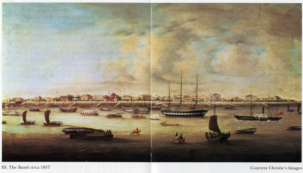 Information data : This view of the Bund from 1857 continues the typology developed in earlier painting. The scope of the painting covers the whole Bund from the British Consulate to the edge of the French Concession on the settlement's southern boundary. This is the first painting that includes the entire area of what will become known as "the Bund" proper. Perhaps earlier painters did not think the collection of buildings south of the Russell & Co. compound worthy of representation or preferred to focus their efforts on the central and northern Bund.
