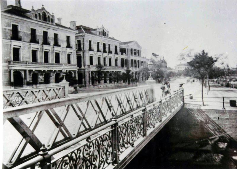 Information data : The stone bridge connected the French Concession (south) and the International Settlement (north) over the Yangjingbang creek. It was demolished, when they drained the channel to build Avenue Edward VII.