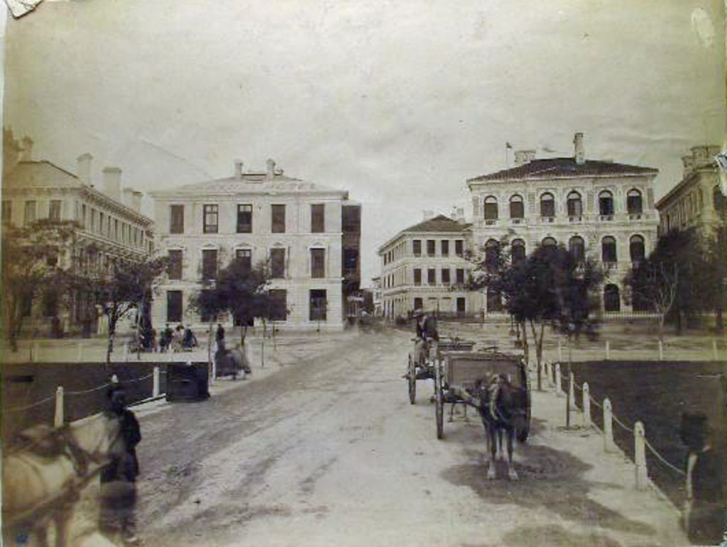 Caption on support : Handwritten caption: 'Oriental Bank, Central Hotel (see roof), Sassoon [unclear] opium merchants. This view is taken from the end of the jetty [?] on [?] which the water carts are waiting to get filled from the river. The road or street actuall called Nankin Road, between Central Hotel and Sassoons runs right through the settlement of a city one mile in length. The dark looking patches on the left and right are the beautiful grass preserves which run all along the riverside.'