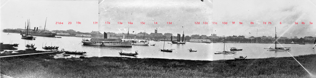Information data : This picture was reconstructed using the three pictures listed as "View of the Bund and Huangpu River from Pudong". The photographer took them from the very same place as scale matches perfectly. This allows for a wide-angle view of turn-of-the-century Bund.