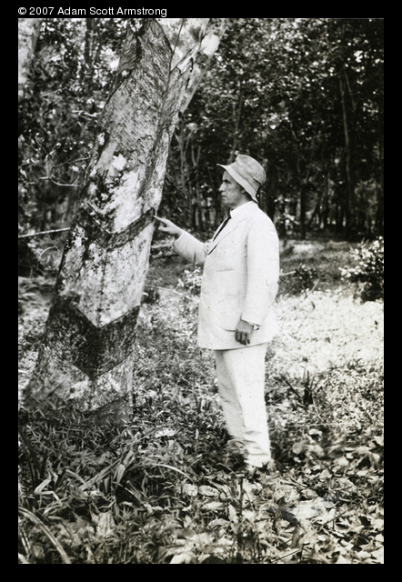 Title : William Armstrong indicating tapping scars on a rubber tree