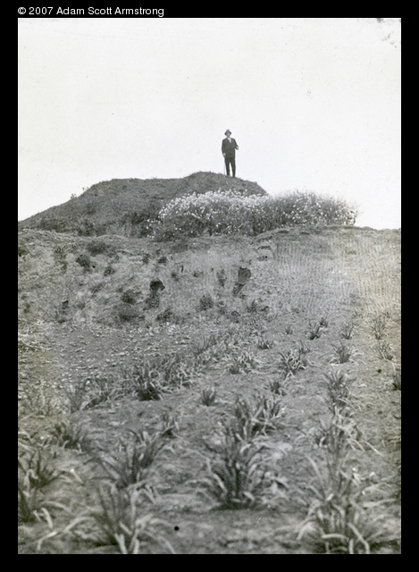 Title : A man on a pile by a field