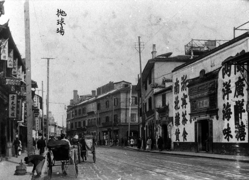 On the right-hand side of the road, a shop with large characters advertising: "Miscelleneous gooods from North and South" (南北雜貨), "Tea and food from Ningbo/Zhejiang" (浙寧茶食), "Seafood from the two oceans" (兩洋海鮮), "Sugar from Fujian, Guangdong and the West" (閩廣洋糖).