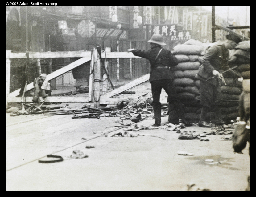 Aftermath of the storming of the North Chekiang (Zhejiang) Road barrier, Shanghai, by deserting White Russian mercenaries seeking asylum in the International Settlement as the National Revolutionary Army takes the city, c.22 March 1927.