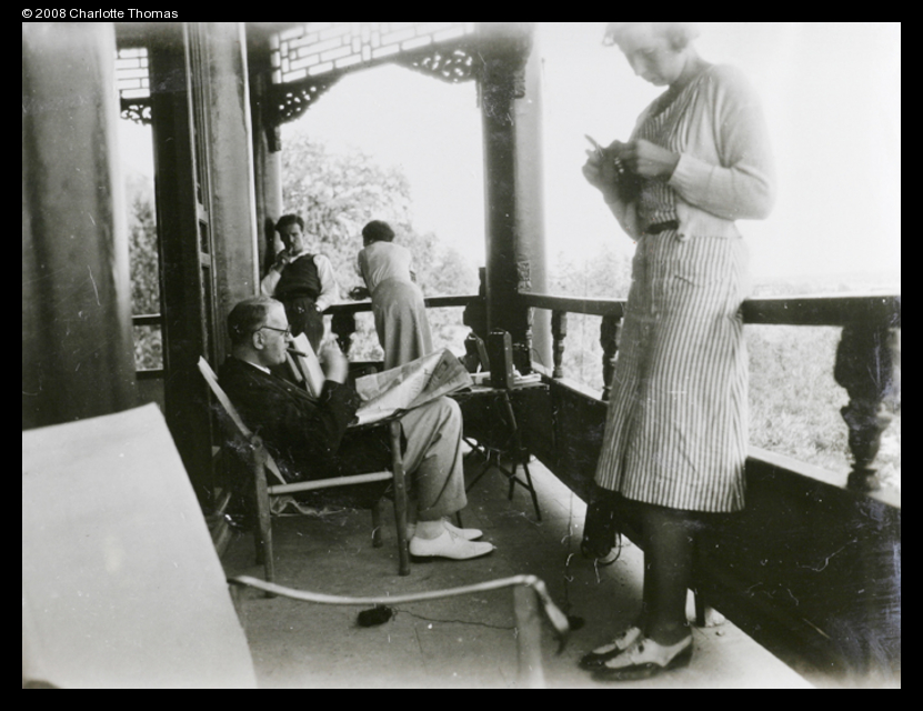 Sir Miles Lampson, British Minister in China (reading newspaper, seated) and excursion party at the Summer Palace, near Beijing.
