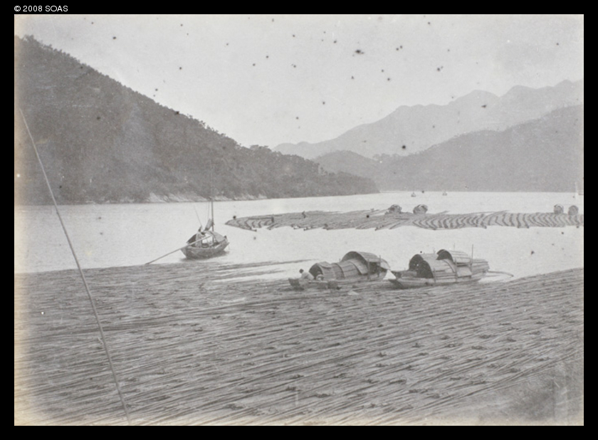 Caption on support : Bamboo rafts. Yuen Foo river.