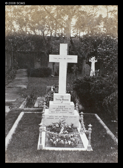 No caption for this photo. The gravestone is inscribed "In loving memory of LIZZIE the beloved wife of JOHN ODELL, died 13th January 1888".