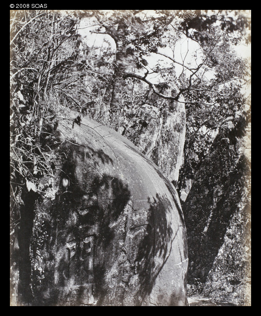 No caption in the album for this photo of a large rounded boulder with a Chinese inscription on a wooded hillside.