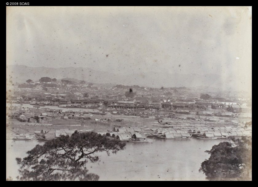 No caption in the album for this view of many Chinese boats moored beside a city (Maybe Foochow Fuzhou), with hills in the distance.