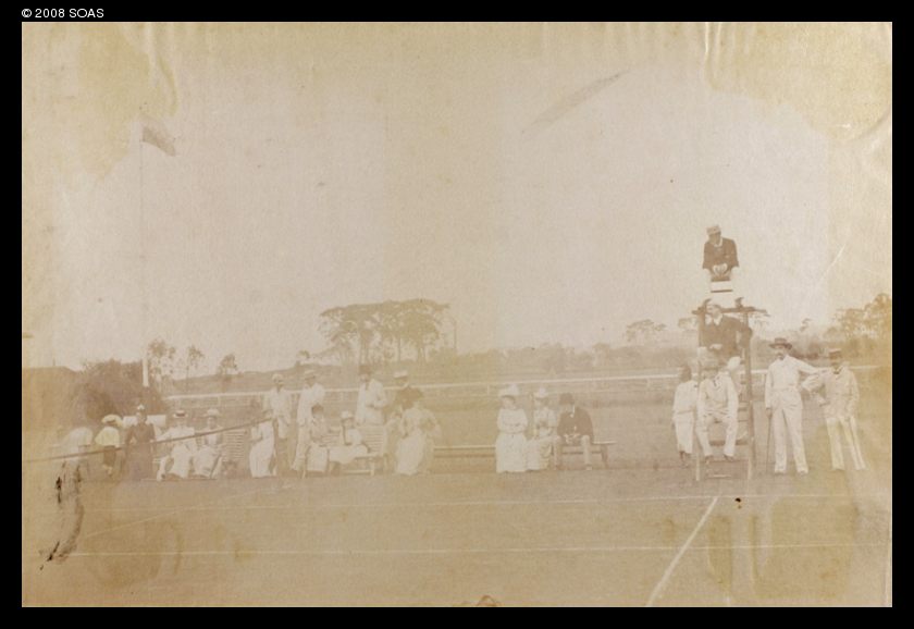 Umpire and spectators at a tennis match, Foochow