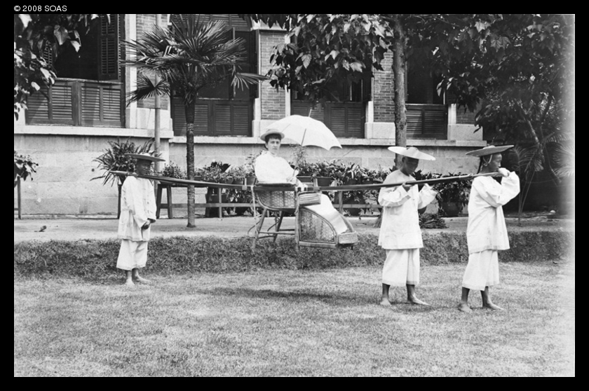A woman in a sedan chair, with bearers