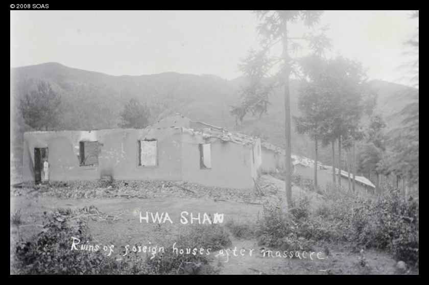 No caption in the album for this photo, but reversed out of the negative, is the caption: “HWA SHAN Ruins of foreign houses after massacre.” Photo shows burnt out houses.
