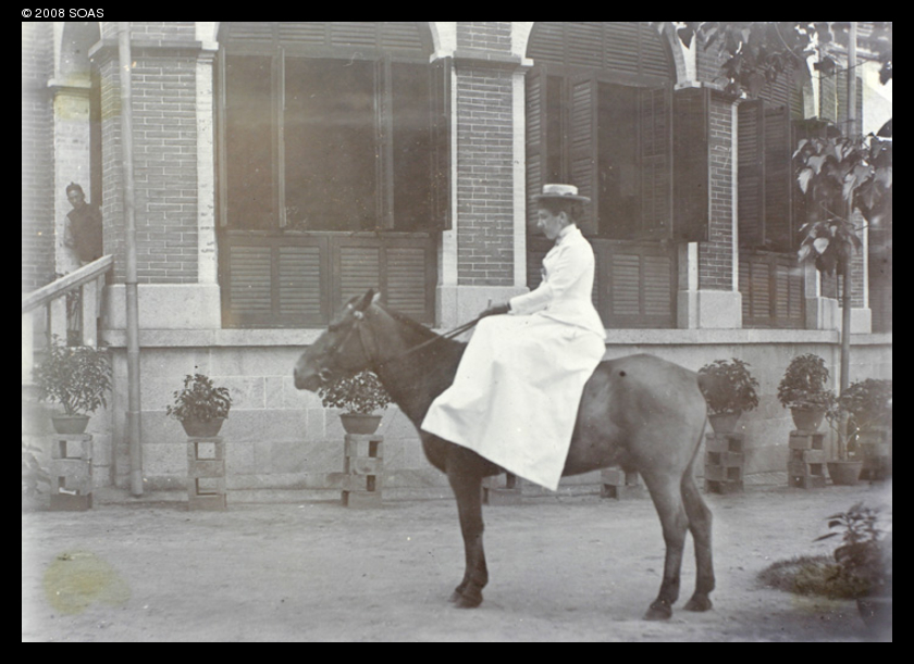 No caption in the album for this photo of a woman sitting side-saddle on a horse outside the same house as in os04-072.