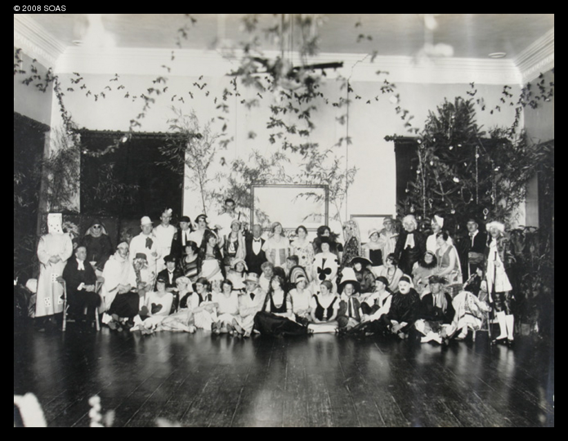 No caption in the album for this photo of a large group in fancy dress posing in a large room. A different fancy dress party to os05-130, but in the same room. At Christmas time. Possibly Foochow (Fuzhou).