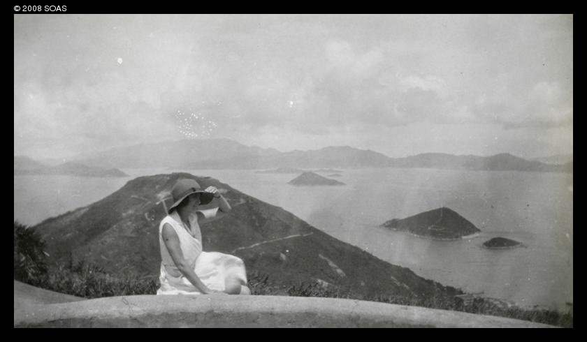 No caption in the album for this photo of a woman looking at the view of islands in a bay. Maybe Hong Kong? 1920s?